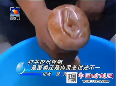 《西安零距離》前天新聞中,播出當地1個農夫在家中掘水井,抓到長約19公分,兩頭菌傘狀、開眼的柱狀物,懷疑是傳說中生長在西安秦嶺附近 的千年神物「太歲肉靈芝」,還在節目上認真量長度,引述《本草綱目》解釋肉靈芝的資料,但其實這個「太歲肉靈芝」是個矽膠自慰器。