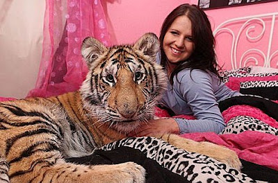 這 是佛莉西亞和她的寵物,一隻6個月大的孟加拉虎在他們的床上,由於佛莉西亞父母親職業的關係,她從小就和大象老虎等動物為伍,這隻老虎叫做威 爾,出生後就 變成佛莉西亞的寵物,兩人還睡在同一張床上,平時日一起散步玩耍吃飯,這位大膽的少女,一點都不擔心,萬一半夜老虎突然肚子餓了怎麼辦,還打 算和牠睡到1 歲,佛莉西亞說,就好像養狗一樣,而威爾並不是第一隻和她分享大床的老虎,威爾的父親也曾跟佛莉西亞睡在起1年。