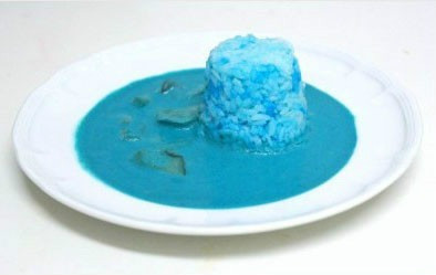 其實在藍色拉麵出來之前,就有店家突發奇想販售「藍色 咖哩飯」,這款咖哩飯確實吸引了大家的注意,但很多人表示看到這道菜反而食慾大減,因此得到了「食欲減少藍咖哩」的稱號。