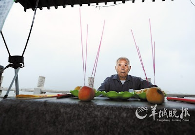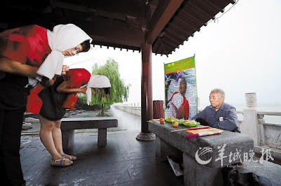 18日在武漢的這場“活祭”,不是第一次。16日上午,在湖南長沙杜甫江閣附 近,賀中民披着藍色雨衣,盤腿坐在地上,身前的水泥檯面上,擺放着食物和香燭。老人面前,兩個頭包白布的女子身披紅紗,捧香祭拜,口中念念有 詞。有人一湊 過來圍觀,就會收到傳單,宣傳賀中民的“英雄事跡”。“活祭”現場擺放的2米高的宣傳海報上說,賀中民是中國好父親,是湖南邵陽市邵東縣的 “建設之父”。