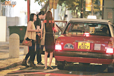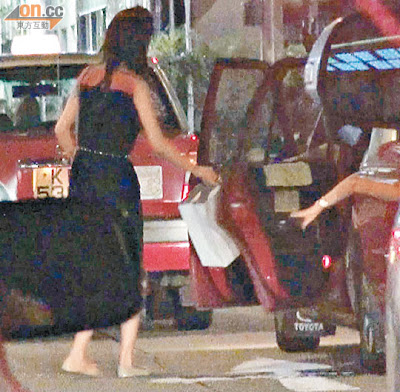 三人上的士,原來是送峯女郎吳千語(Karena)回家,下車後峯女郎吳千語(Karena) 從黃子桓手上取過一袋東西才上樓。